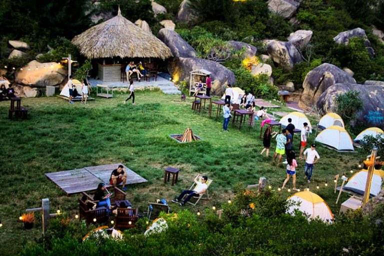 Đặt chân đến Khu dã ngoại Trung Lương, du khách sẽ gặp ngay khu nhà hàng với những món hải sản tươi ngon, đậm đà hương vị biển. Tiếp đó là khu vui chơi, cắm trại với đồng cỏ xanh, những chiếc lều nhỏ xinh hướng mặt về phía biển.